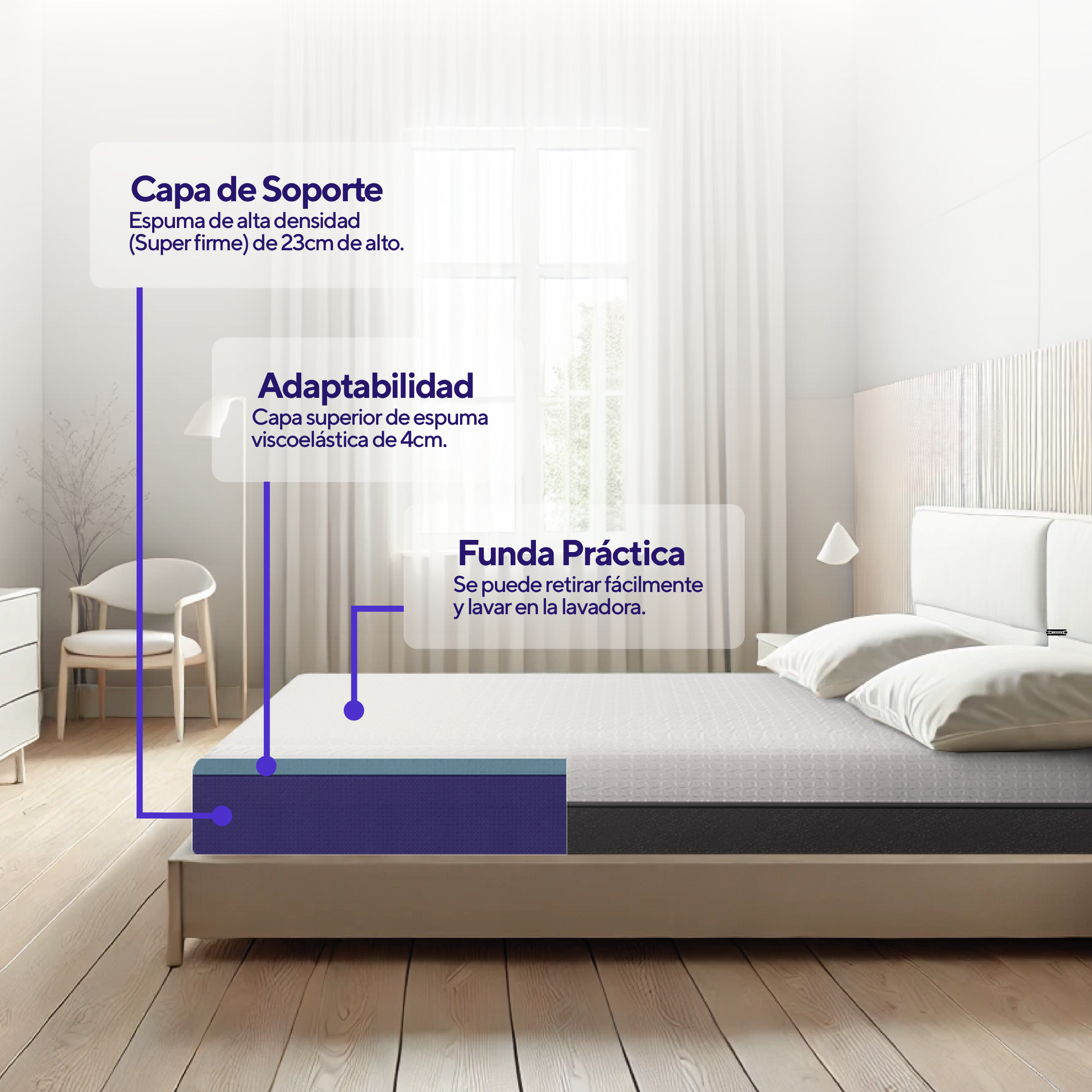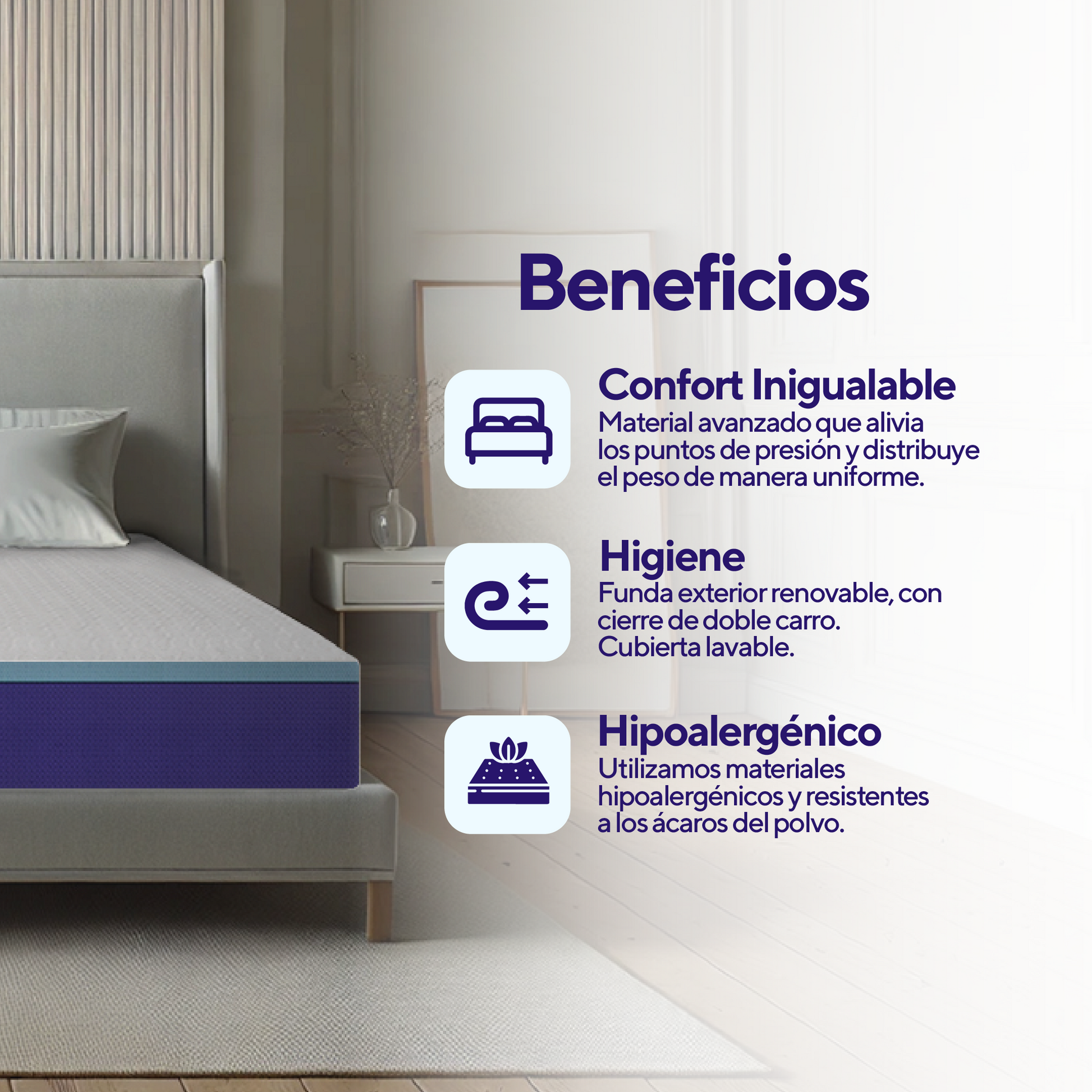 Este material avanzado se adapta a la forma de tu cuerpo al reaccionar con el calor y la presión. Su principal beneficio es reducir los puntos de presión en áreas como hombros, caderas y espalda baja, mejorando la calidad del sueño. Además, ayuda a minimizar el movimiento, ideal si compartes la cama con alguien más.